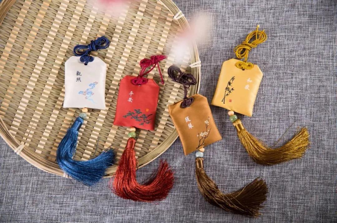 制作、佩戴端午香囊是中华民族的民间节日习俗。古时人们会给小孩子佩戴香袋,不但可以作为衣襟的点缀,还有避邪驱瘟之意。依据不同植物配方,有着不同的意义和作用。