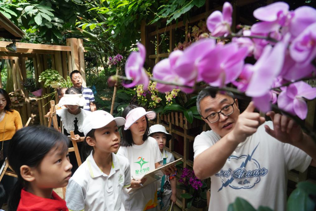 “这是蝴蝶兰,扎堆摆放的它们就像是一群成群结队的蝴蝶正在翩翩起舞,它的赏花期长,还能够吸收室内的有害气体。”植物园的温室内,南山植物园高级工程师鞠学勇正在仔细地为学生讲解每一株植物的特征。