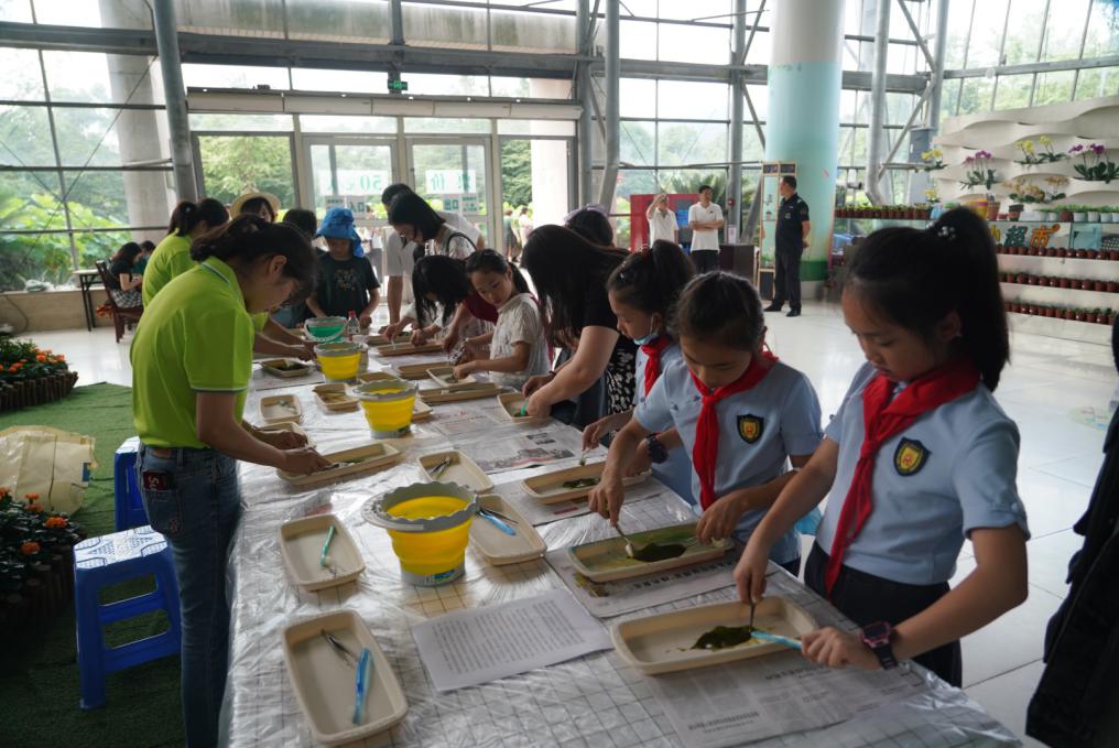 叶脉书签制作区,工作人员为学生们讲解着叶脉的特点,并教授他们制作叶脉书签。选取树叶、腐蚀叶肉、清洗叶脉,再经过漂白、染色和干燥等环节,一个精美的叶脉书签就可以制作完成。