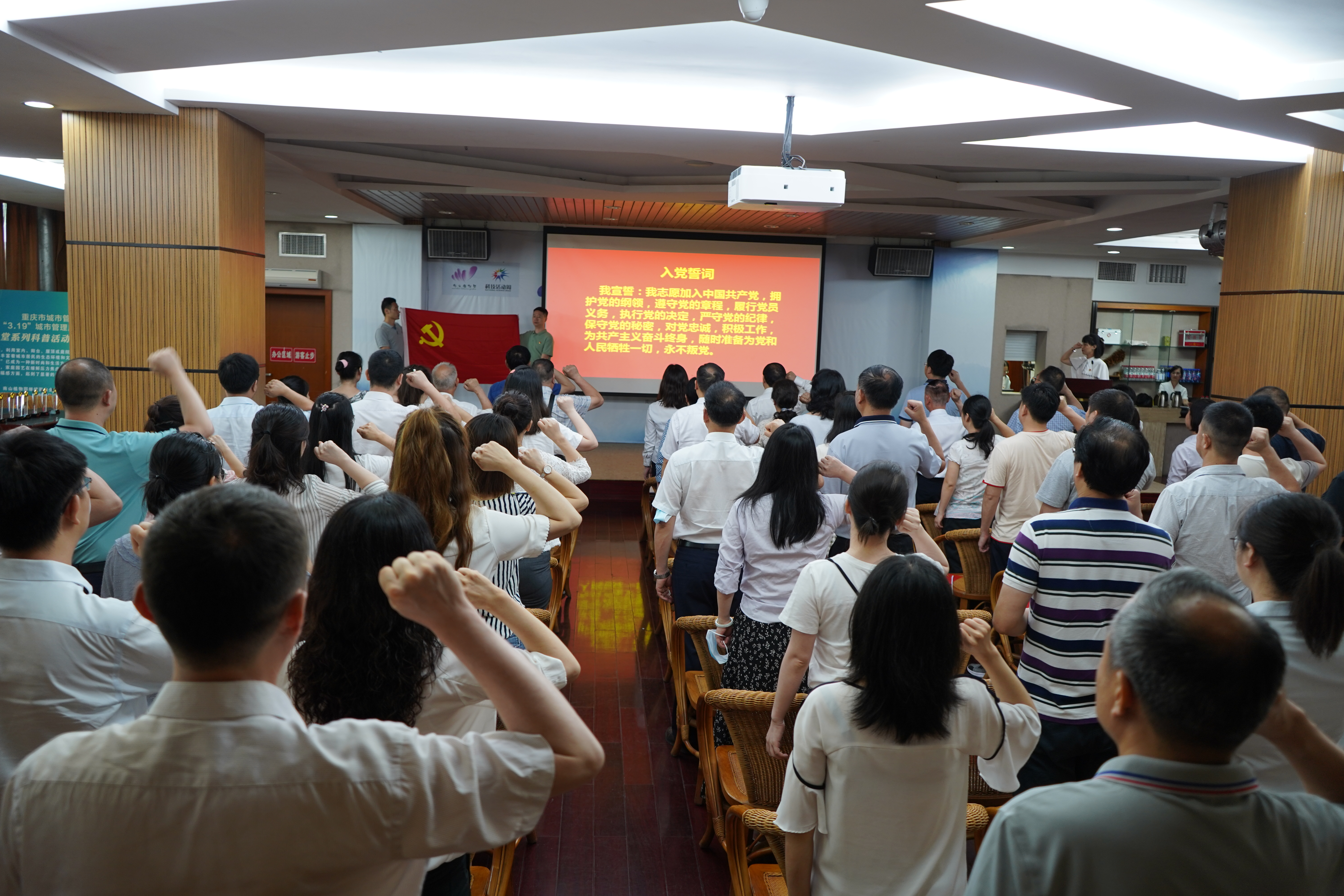7月1日上午,植物园全体党员干部佩戴党徽收看庆祝大会直播后集体合影,正式拉开活动序幕。大家一起唱响国歌,观看了植物园党建宣传视频以及党员快闪MV,党委书记发表开场讲话并带领七十余名党员在党旗下重温入党誓词。
