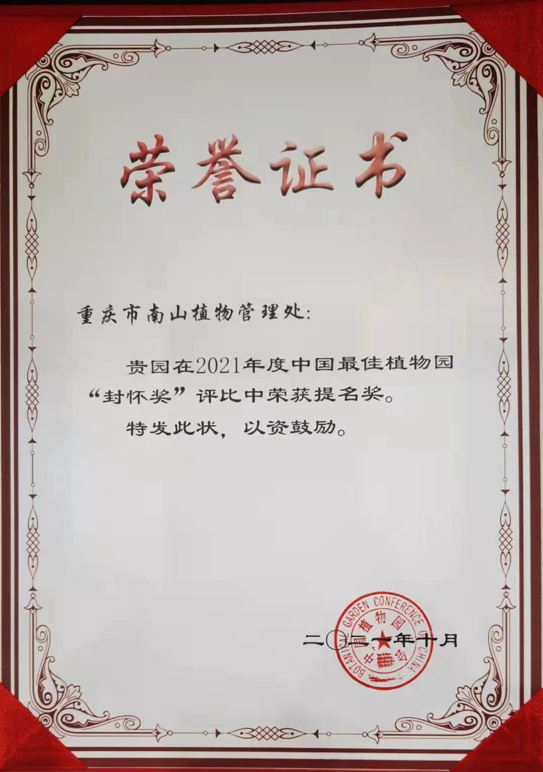 于10月9日开幕的2021年度中国植物园学术年会获悉,重庆市南山植物园被授予“封怀奖”年度最佳植物园提名奖并给予表彰。“封怀奖”的评选是为正确引导中国植物园的发展方向,引领植物园的可持续发展,面向全国近200所植物园,评选出的年度工作取得重大进展、业绩突出的植物园。
