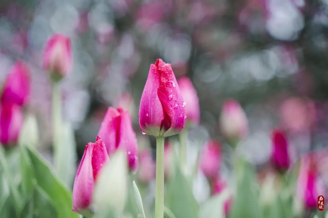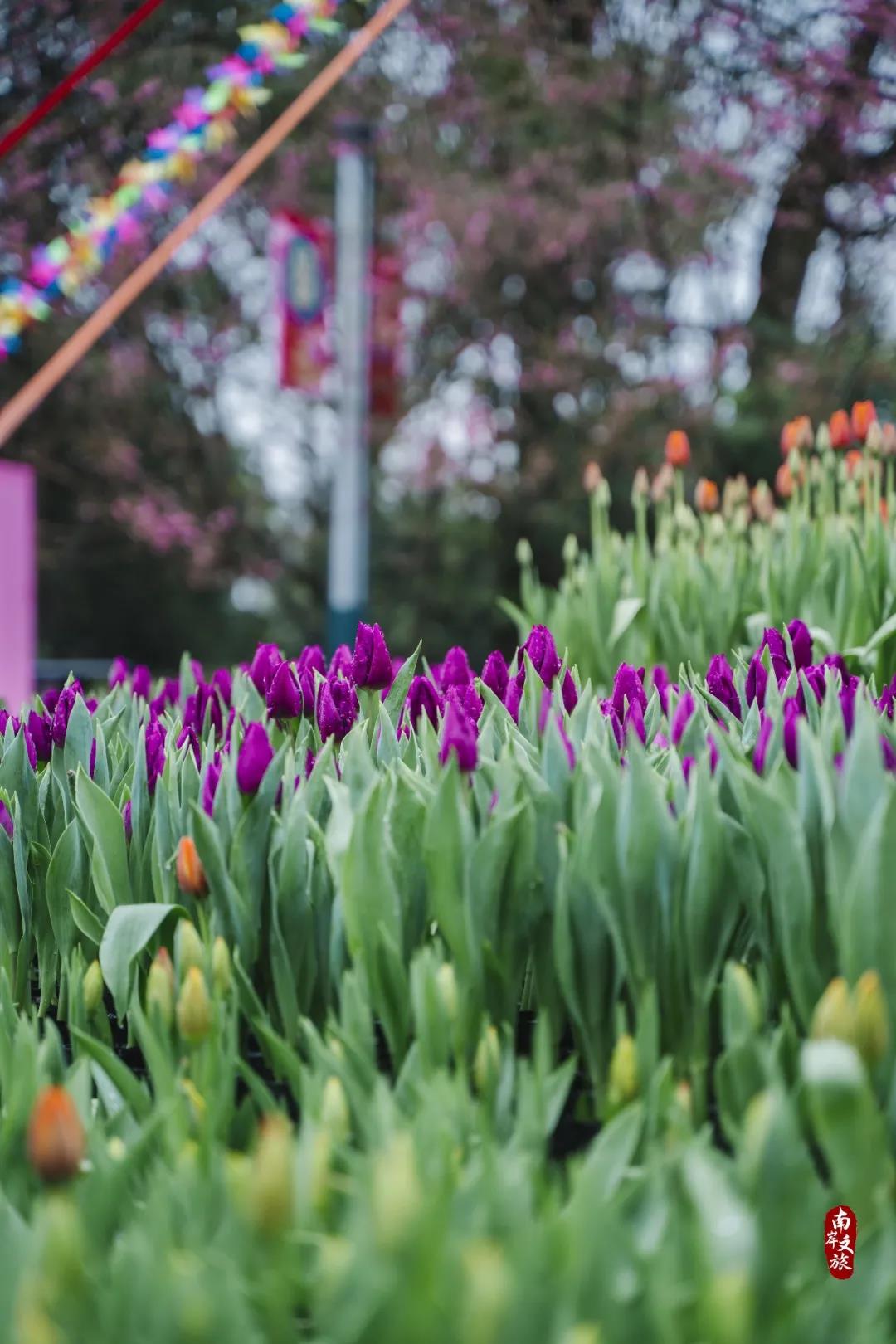 除了浪漫的樱花挂在枝头,南山植物园近20万盆郁金香也如缤纷花海一般装点着整个南山植物园,它们在风中轻轻摇曳,卷起一阵阵花浪,荡漾出缤纷的色彩,传达着浓浓的春意。
